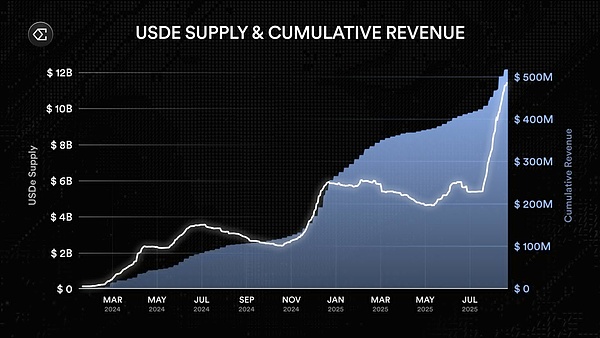 短期(戰術層面):USDe已經成長為DeFi最大的收益型資金蓄水池。其 125億美元的流通規模和在Aave上47億美元的風險敞口,使其在DeFi借貸市場中具備了“一級抵押資產”的地位。與此同時,USDe的 9–11%年化收益已被市場視為類“無風險利率”,成為流動性聚合的核心錨點。這一階段的邏輯在于:規模與收益的持續強化,讓USDe成為全生態的資金樞紐,為協議現金流提供了穩定積累。